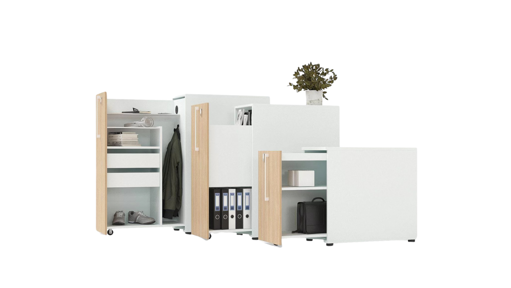 Unsere Container- und Stauraumlösungen bieten eine perfekte Kombination aus Flexibilität und Design. Die Standcontainer ziehen sich durch ihre Robustheit aus und bieten festen Stauraum mit verschiedenen Schubladen- und Ablageoptionen, die für Ordnung sorgen. Im Gegensatz dazu bieten Rollcontainer maximale Flexibilität, da sie einfach verschiebbar sind und sich an jeden Arbeitsplatz anpassen lassen. Unsere Apothekerschränke sind platzsparend und ermöglichen einen schnellen Zugriff auf Ihre Unterlagen und Arbeitsmaterialien, während multifunktionale Behälter zusätzlich mit praktischen Extras wie Sitzflächen, integrierten Steckdosen oder abschließbaren Fächern ausgestattet sind.